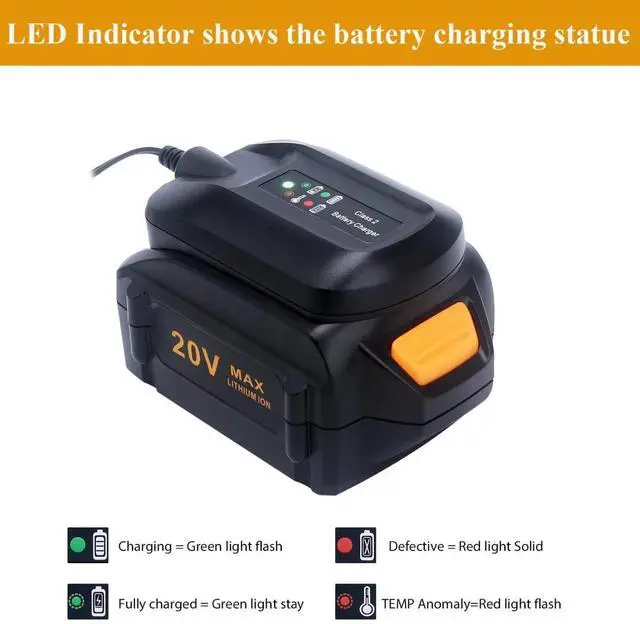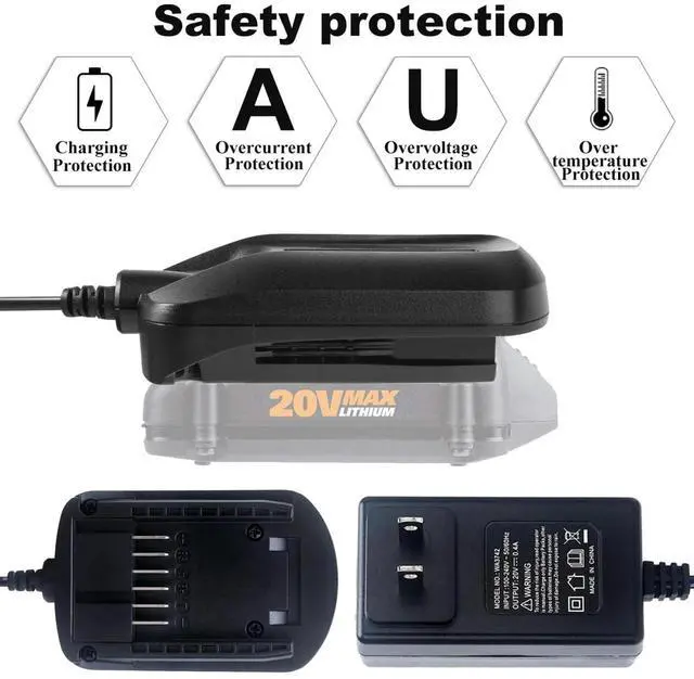 The 20V Fast Charger is a high-efficiency charging solution designed for seamless compatibility with WA3732, WA3742, WA3868, WA3578, WA3575, WA3520, and WA3525 battery packs. Engineered to deliver rapid charging performance, this charger ensures your batteries are powered up quickly and reliably, minimizing downtime and maximizing productivity. Its robust construction supports consistent output, providing safe and stable charging for a range of 20V battery models. Ideal for both professional and home users, this charger is an essential accessory for maintaining optimal performance of your cordless tools.