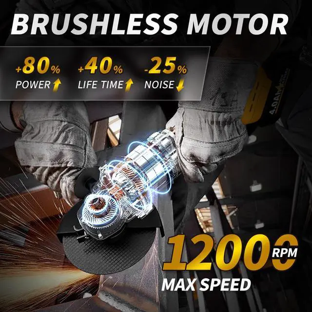 [ Brushless Motor & 4.0Ah Batteries ] -- Cordless angle grinder is equipped with a powerful brushless motor that can rotate up to 12000 RPM. 2 x 4.0Ah high-capacity batteries can ensure long-term operation and greatly improve your work efficiency.