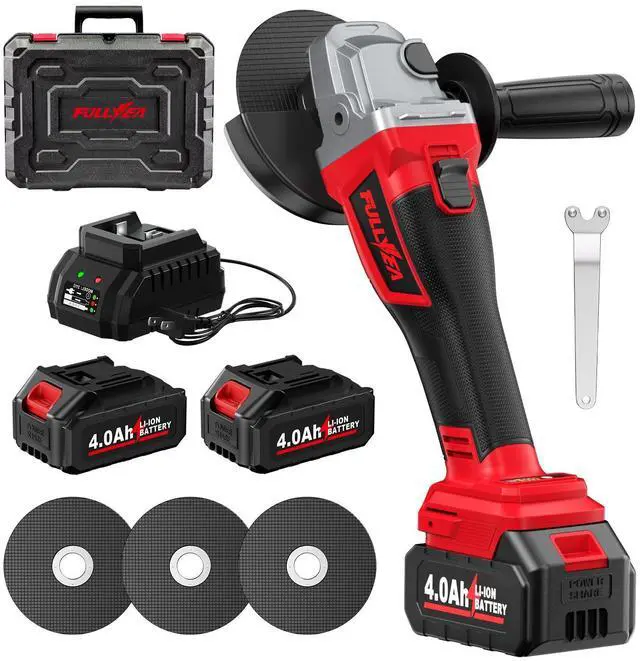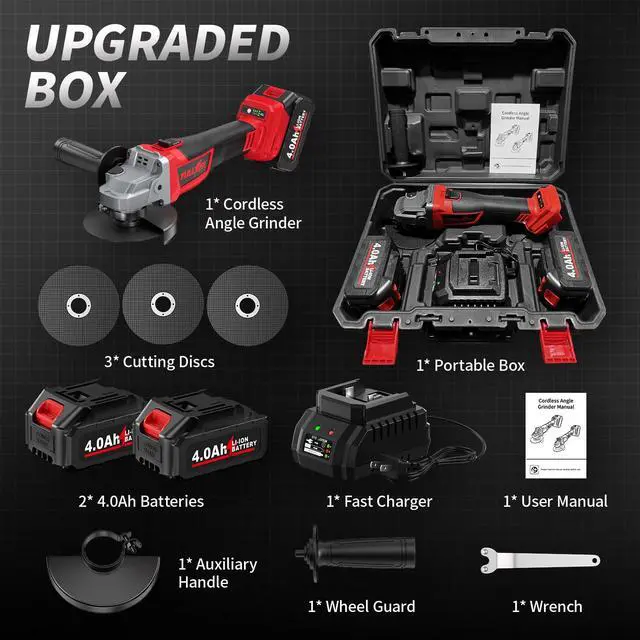 [ Complete Set You Need ] -- 1 x Angle Grinder Cordless, 3 x 4-1/2" Cutting Wheels, 2 x 4.0Ah Batteries, 1 x Fast Charger, 1 x Wrench, 1 x Removable Handle, 1 x Safety Cover, 1 x User Manual, 1 x Portable Tool Box.