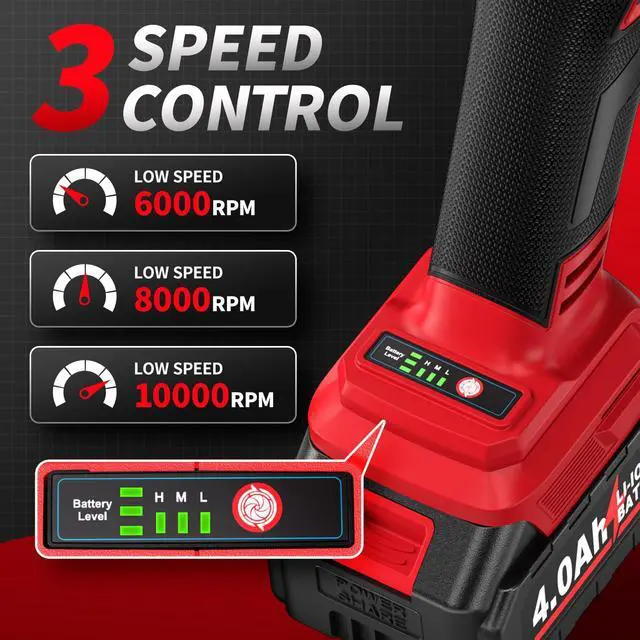 [ 3-Speed Adjustment ] -- FULLYEA 4-1/2 inch angle grinder offers 3 speed settings: High Speed - 12000 RPM, Medium Speed - 9000 RPM, and Low Speed - 6000 RPM. You can easily adjust speed to meet cutting, grinding and various needs.