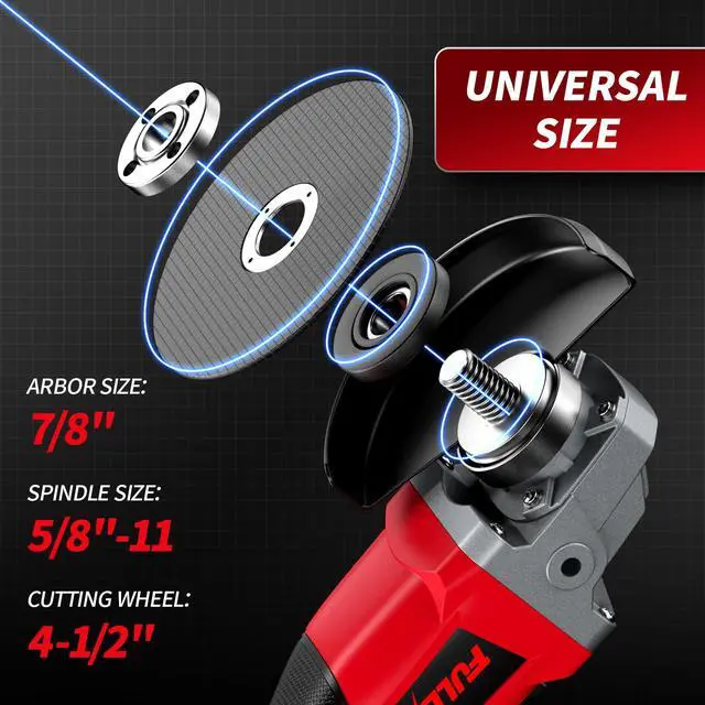 [ Universal Size ] -- Angle grinder tool has 7/8 inch arbors. It can compatible with various 4-1/2 inch-5 inch blades, discs and grinding wheels. The angle grinder is equipped with a spindle lock, which allows you to replace the disc faster and easier.