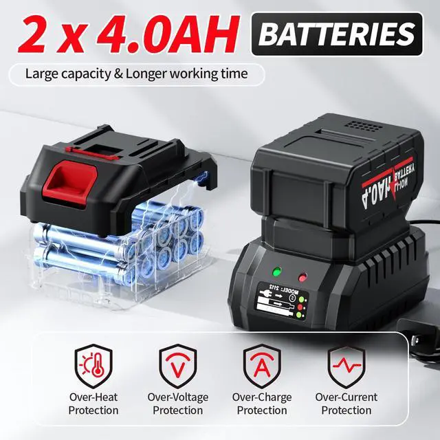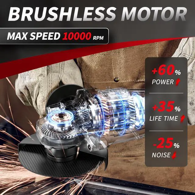 [ Brushless Motor & 2*4.0Ah Batteries ] -- Cordless angle grinder is equipped with a powerful brushless motor that can rotate up to 12000 RPM. 2 x 4000mAh large-capacity batteries can ensure long-term operation and greatly improve your work efficiency.