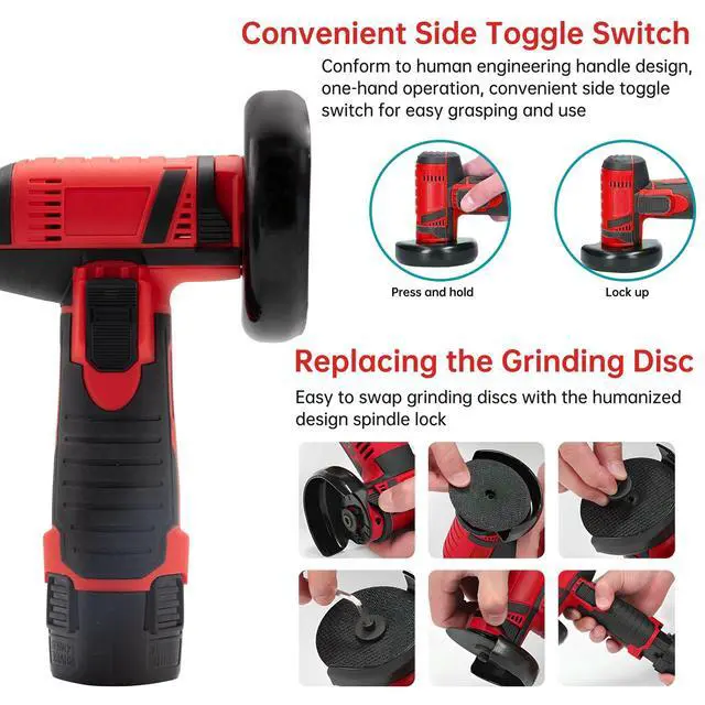 The humanized spindle lock makes it easy to replace the grinding disc. The side toggle switch design and the side automatic locking start switch make the small angle grinder ergonomically designed, easy to grind, and can be operated with one hand.