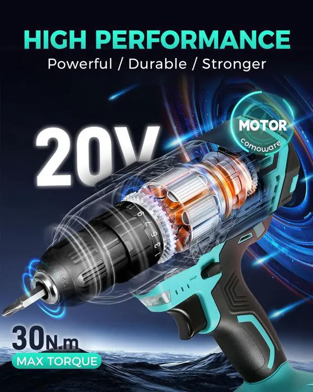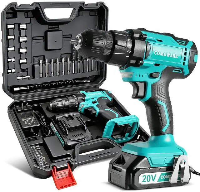 COMOWARE 20V Cordless Drill, Electric Power Drill Set with 1 Batteries & Charger, 3/8 Keyless Chuck, 2 Variable Speed, 266 In-lb Torque, 17+1 Position and 34pcs Drill/Driver Bits
