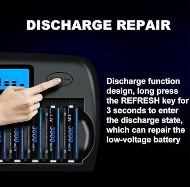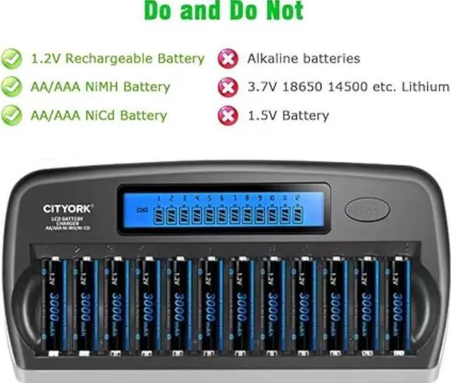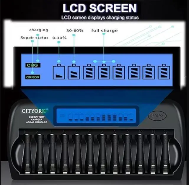 *Charger for TV remotes, gaming controllers, wireless mouse, wireless keyboards, kids toys, clocks, and many more. Easy to read battery status LCD screens - Smart LCD screen will indicate the whole charging process for the AA/AAA batteries; View each battery's charging or discharging status on the LCD lit screens. 12-Slot smart battery charger with LCD,easy to understand and easy to see, even when charging in the dark.