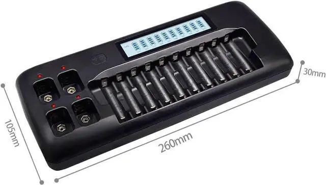 Package: 1* 10+4 Bay Smart LCD Universal Battery Charger for Rechargeable AA AAA NIMH/NICD & 9V NIMH/NICD/Lion Rechargeable Batteries, Fast charging.