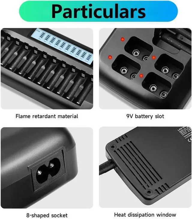 Upgraded Charging Freely:10+4 bay universal battery charger allow you to charge 1-10PCS AA AAA Ni-MH/Ni-CD rechargeable batteries and 1-4 PCS 9V Li-ion/Ni-MH/Ni-CD rechargeable batteries.