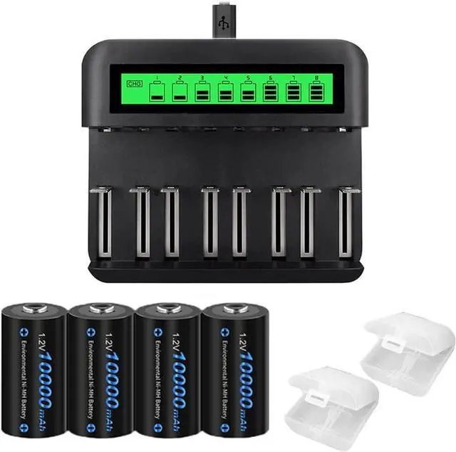 4 Pack 10000mAh Ni-MH Rechargeable D Size Batteries with 8 Bay 1.2 v AA AAA C D LCD Universal Battery Charger