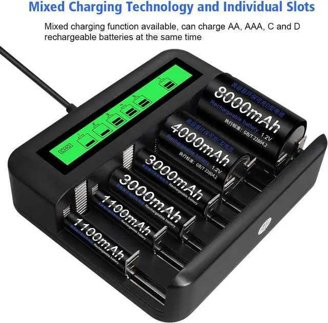 LCD Battery charger: universal AA AAA C D LCD battery charger, 4 slots for C / D Ni-MH rechargeable batteries; 8 compartments for 1/2/3 ... 7/8 pieces 1.2V AA / AAA Ni-Mh Ni-CD rechargeable