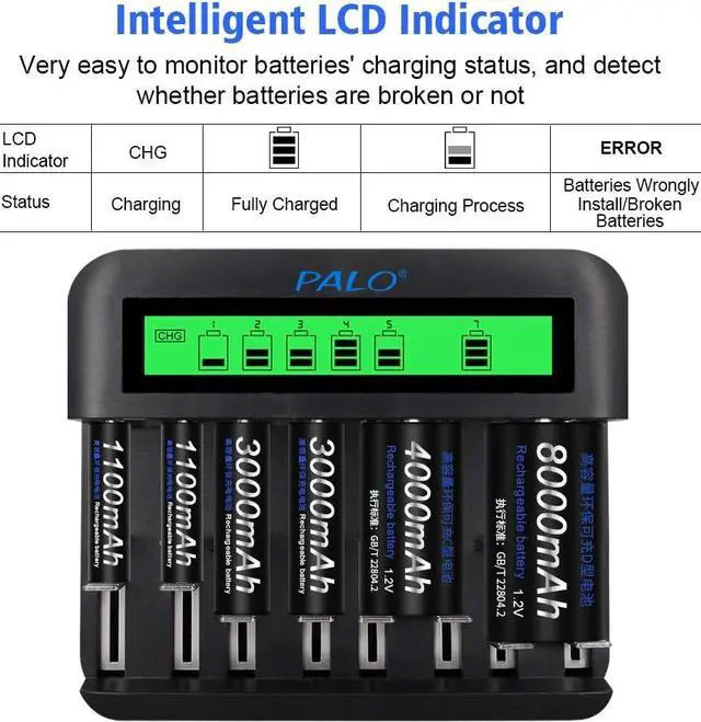 LCD Display Charger: Clearly shows the charging process of each battery and the battery icon stop flashing when fully charged, let's you know the charging status at a glance; displays "ERROR" when it detects non-rechargeable or defective batteries.