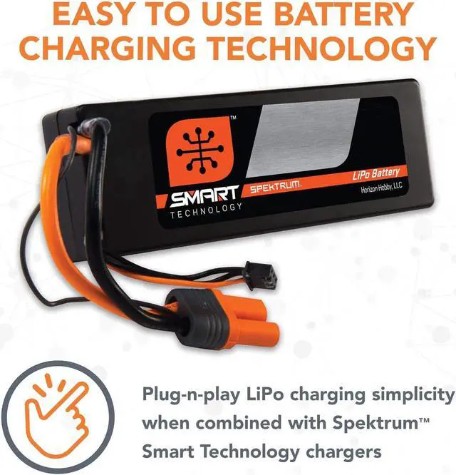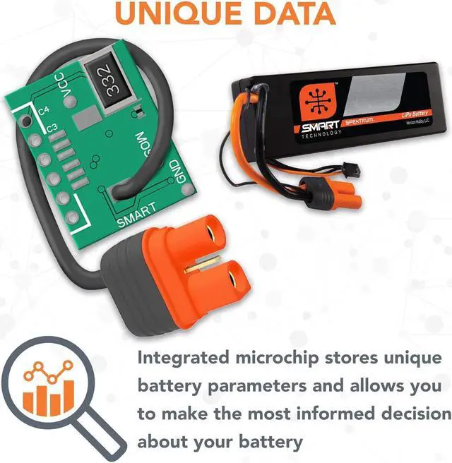 Feature Overview: You'll never have to set charge preferences for a Spektrum Smart battery until you want to. When a Spektrum Smart LiPo battery is connected to a Spektrum Smart charger, unique parameters and health of that Smart LiPo battery upload from the Smart memory microchip integrated into the battery. Through the charger, you can view and set preferences, such as charge rates, so that all you have to do to charge the pack every time is press the charger "Start" button. Smart technology takes care of the rest. Our new Spektrum Smart 50C LiPos come in a variety of popular sizes and are ready to drop into your RC car or boat for better performance, power, and reliability. These battery packs are a great upgrade for those looking to get more punch and off the line power on nearly any setup. Spektrum Smart LiPo Batteries Store Unique Data, Such
