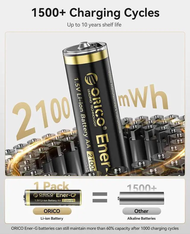 • High Capacity & Long-Lasting Power ORICO rechargeable AA batteries feature an improved lithium-ion cell with 2100mWh high capacity, delivering long-lasting performance for everyday devices thanks to their higher energy density