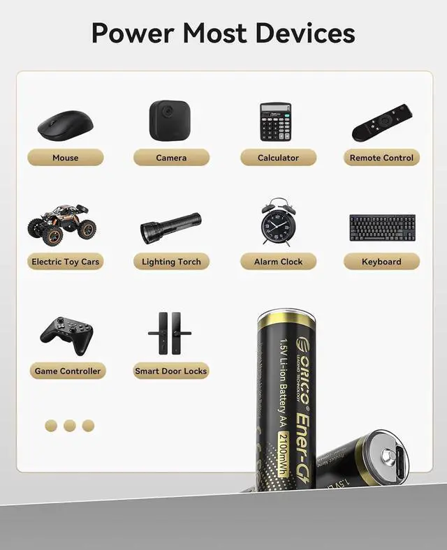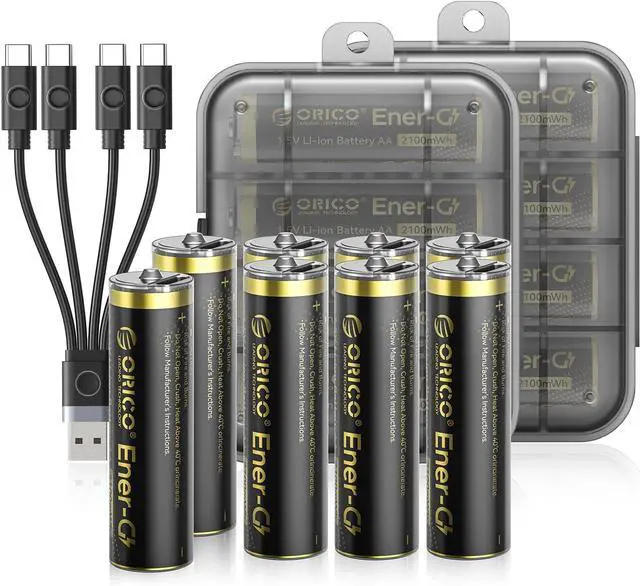 ORICO Ener-G Lithium-ion Battery Rechargeable AA Batteries with Tpye C Charging Cable 8-Pack Double A Batteries 1.5V 2100mWh Capacity 1500+ Cycle Times for Xbox Controllers/Electronic Toys
