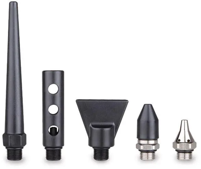 Five multipurpose nozzles are included: Air Shield Nozzle, High Flow Nozzle, Air Concentration Nozzle, Air Spreader Nozzle, and Rubber Tip. The Air Shield Nozzle creates a side air flow forming a shield to prevent a backflow of dust to user, the High Flow Nozzle doubles the air flow, the Air Concentration Nozzle focus air on specific spots, the Air Spreader Nozzle distributes air over a wide area, and the Rubber Tip help protect delicate surfaces while you work. These 3/8-24 threaded accessories are compatible with Capri Tools CP21089 2-Way Air Blow Gun. They are also compatible with Capri Tools CP21350 High Performance Air Blow Gun via an adapter
