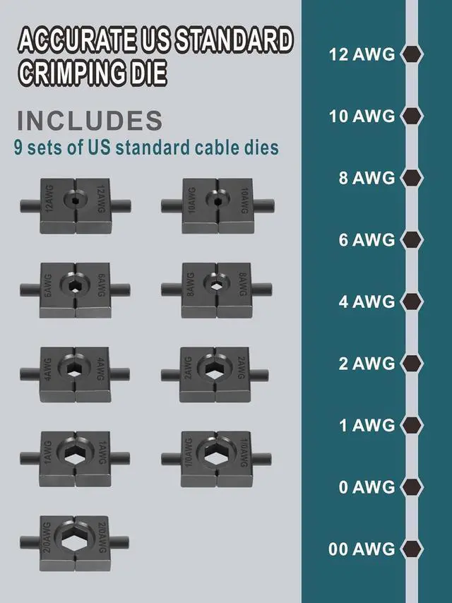 Standard AWG cable die: die is designed according to the American standard wire gauge, Choose it and say goodbye to those inaccurate metric dies Including 12, 10, 8, 6, 4, 2, 1, 1/0 and 2/0 high-strength dies