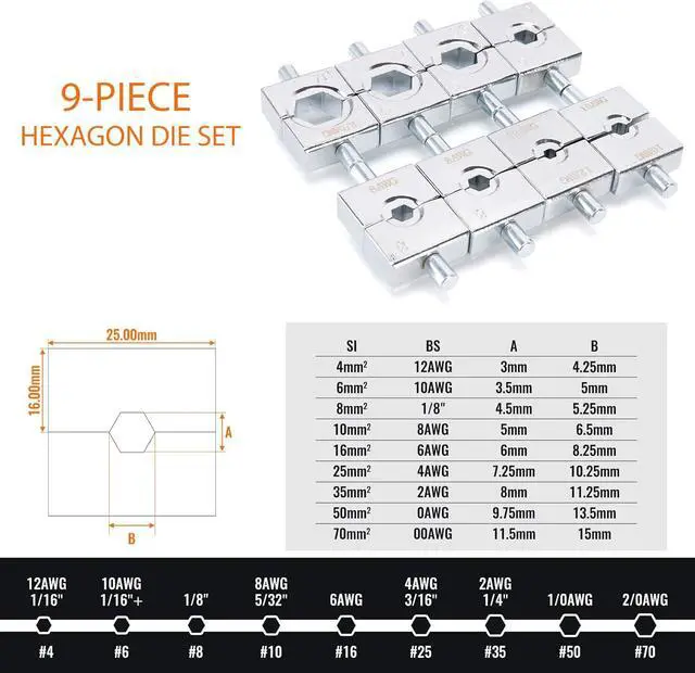 9-Piece Hexagon Die Set: Hydraulic crimping Tool kit with 9 durable dies (12, 10, 8, 6, 4, 2, 1/0, 2/0 AWG + 1/8 for stainless steel wire rope) for versatile crimping. Enhanced die guides prevent misalignment during operation.