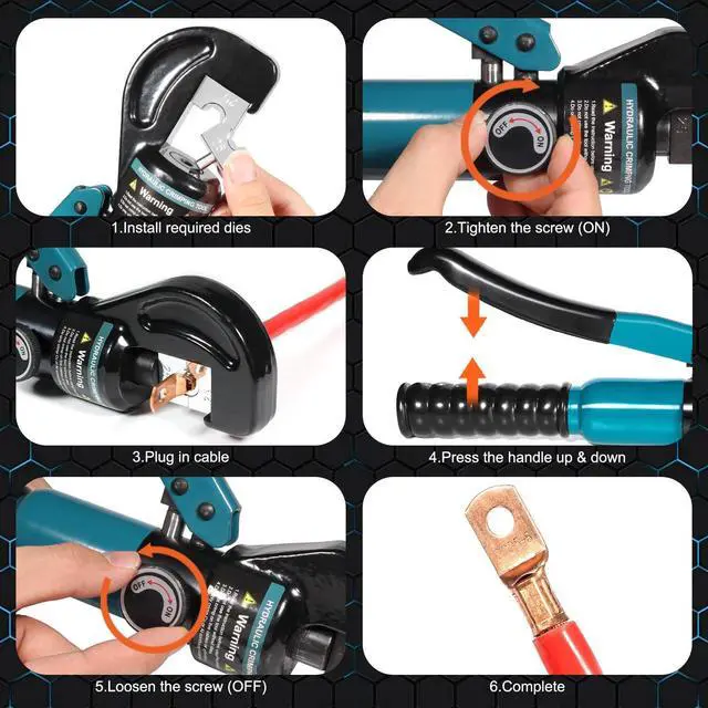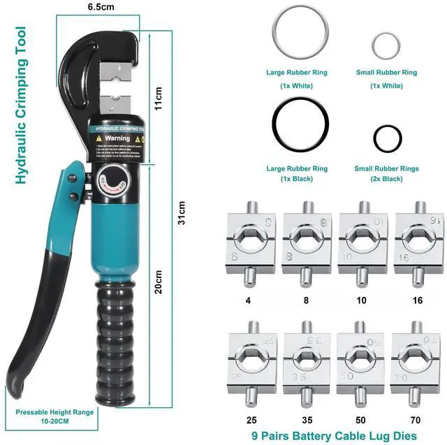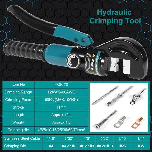 Hydraulic crimping tool 9 pairs of dies: 12.10.8.6.4.2.1/0. 2/0 AWG and 1/8 "for stainless steel wire rope.