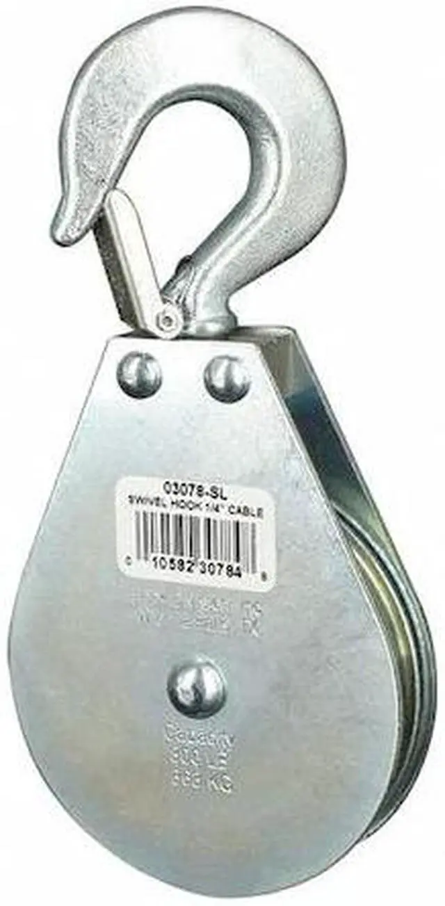 Pulley Block, Product Type Pulley Block, Pulley Type Swivel, Mount Type Upright Mount, Working Load Limit 800 lb, Operation Pulling, Attachment Type Swivel Hook, Compatible Rope Diameter 1/4 in, Sheave Inside Diameter 2 1/2 in, Sheave Depth 7/16 in, Sheave Outside Diameter 3 in, Compatible Rope Type Wire Rope, Bearing Type Sleeve, Attachment Inside Diameter 1/2 in, Housing Material Carbon Steel, Mounting Hole Diameter 1/2 in, Number of Grooves 1, Sheave Material Steel, Overall Height 6 1/4 in. This item has been restricted from sale in the following state (s): []
