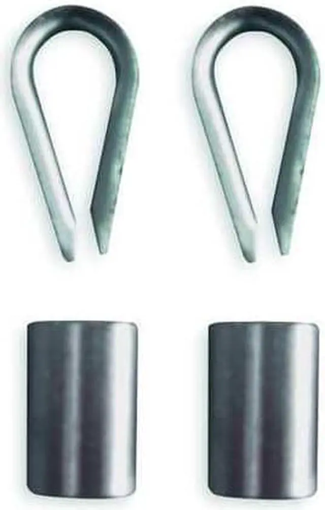 Wire Rope Stop Sleeve and Thimble Kit, Compatible Rope Diameter 3/16 in, Rope Turnback Length Not Applicable, Number of Thimbles Included 2, Total Number of Fittings Included 4, Number of Clips Included 0, Number of Sleeves Included 2, Fitting Types Included Stop Sleeve, Thimble, Clip Material Not Applicable, Sleeve Material Copper, Thimble Material Stainless Steel, Thimble Loop Inside Length 2 in, Thimble Loop Inside Width 1 1/8 in, Compatible Rope Material Copper, Galvanized Steel