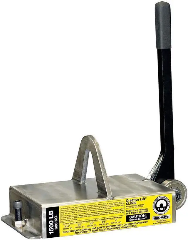 Lifting Magnet, Maximum Flat Load Capacity 2, 200 lb, Maximum Round Load Capacity Not Applicable, Minimum Thickness for Activation 3/16 in, Minimum Thickness for Maximum Load Capacity 3 in, Activation Mechanism Pry-Off Handle with Nonmarring Roller, Magnet Length 11 1/4 in, Magnet Width 9 3/4 in, Magnet Height 2 1/2 in, Overall Length 15 in, Overall Width 10 1/2 in, Overall Height 7 in, Bail Inside Width 3 in, Bail Inside Length 2 7/8 in, Handle Length 16 in. This item has been restricted from sale in the following state (s): []