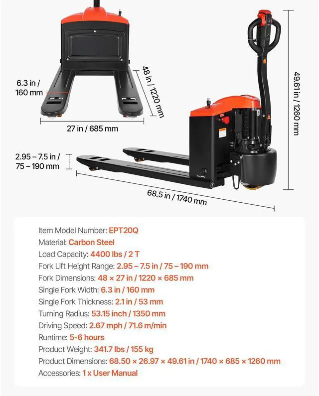 Fork Lift Height Range: 2.95 - 7.5 in / 75-190 mm