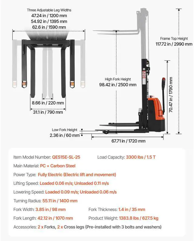 Fork Width Range: 8.66 - 31.1 in / 220 - 790 mm