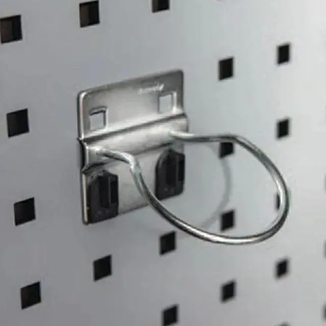 Sub-Category - Pegboard And Slatwall Accessories Tool Holder, Single Ring Tool Holder, Overall Height 2 1/2 in, Overall Width 2 1/4 in, Overall Depth 3 in, Hole Shape Round, Mounting Type Hanging, Hole Size 3/8 in, Hole Spacing 1 1/2 in, Material Steel, Color Silver, Load Capacity 40 lb, Bend Angle -30 Degrees, Bend Height 2 3/8 in, Inside Width 2 3/8 in, Construction Formed, Finish Bright Zinc, Locking System Yes, Includes (2) Ring Hooks, Package Quantity 2. This item has been restricted from sale in the following state (s): []
