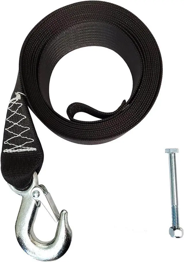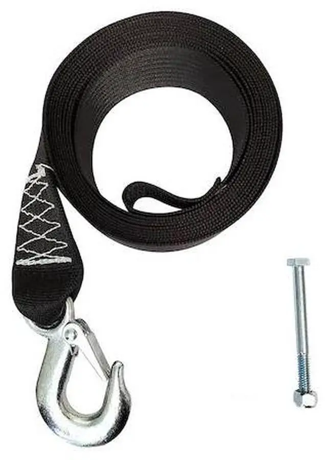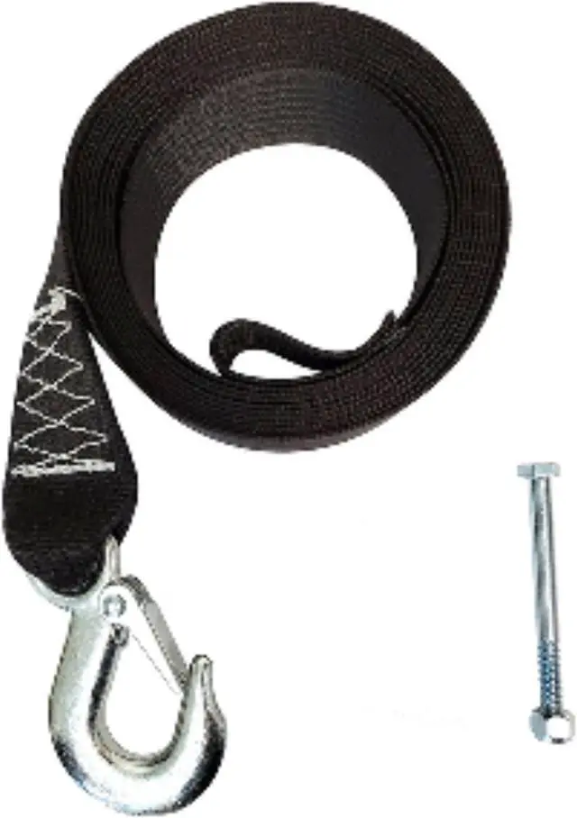 A 12' Replacement winch strap constructed of 7,000 lb. polyester belt and drop forged steel safety snap hook. Includes a bolt and nylon lock nut for drum installation.