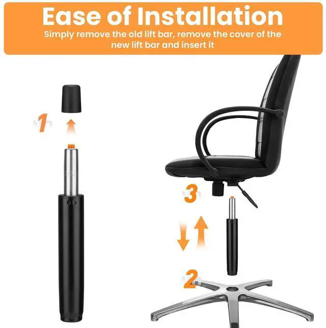 Ease of Installation: Simply remove the protective cap (if present), remove the old pneumatic lift (rubber mallet recommended), insert this new office chair piston, and youre doneno extra screws or complex steps required.