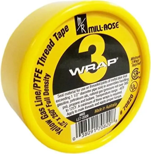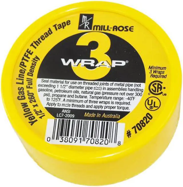 MILL-ROSE, 70820, 1/2" x 260" 3-WRAP Yellow Gas Line Teflon PTFE Thread Seal Tape. Mill-Rose 3-Wrap Yellow Gas Seal Tape is a PTFE thread sealing tape designed specifically for gas lines. This is a full or maximum-density thread sealing tape. Mill-Rose 3-wrap yellow gas seal tape is approved by relevant authorities and used by the gas industry world-wide. It’s color-coded yellow so fitters and inspectors can easily recognize it as an approved tape.