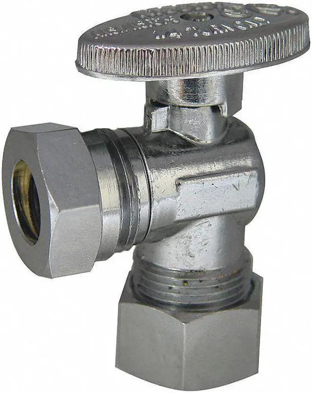 Quarter-Turn Supply Stop, Body Style - Valves Angle, Finish Chrome Plated, Inlet Size 5/8 in, Inlet Type Compression, Outlet Size 1/2 in, Outlet Type Slip, Max. Pressure 125 psi, Temp. Range 40 Degrees to 180 Degrees F, Body Material Brass, Handle Material Chrome Plated Brass, Stem Material Chrome Plated Brass, Standards IAPMO/UPC/SA Listed