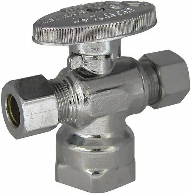 Quarter-Turn Supply Stop, Body Style - Valves 3-Way, Finish Chrome Plated, Inlet Size 1/2 in, Inlet Type FNPT, Outlet Size 3/8 in, Outlet Type Compression, Max. Pressure 125 psi, Temp. Range 40 Degrees to 180 Degrees F, Body Material Brass, Handle Material Chrome Plated Brass, Stem Material Chrome Plated Brass, Standards IAPMO/UPC/SA Listed