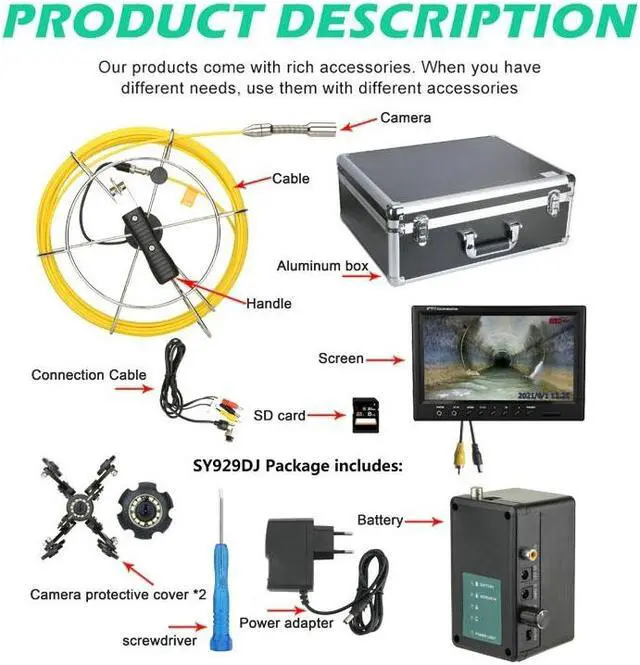 The pipe inspection camera combines a camera-tipped probe with 9" LCD monitor for viewing hard-to-reach inspection area. The deluxe leather sun visor provides clear viewing in outdoor inspection and extra protection for the monitor. It comes with a fully padded case which stores all kits for easy transport and use. It eliminates the needs of tearing drywall to locate leaks and helps to solve pipe problems. It is a must have for any homeowner, contractor and even professional plumbers!