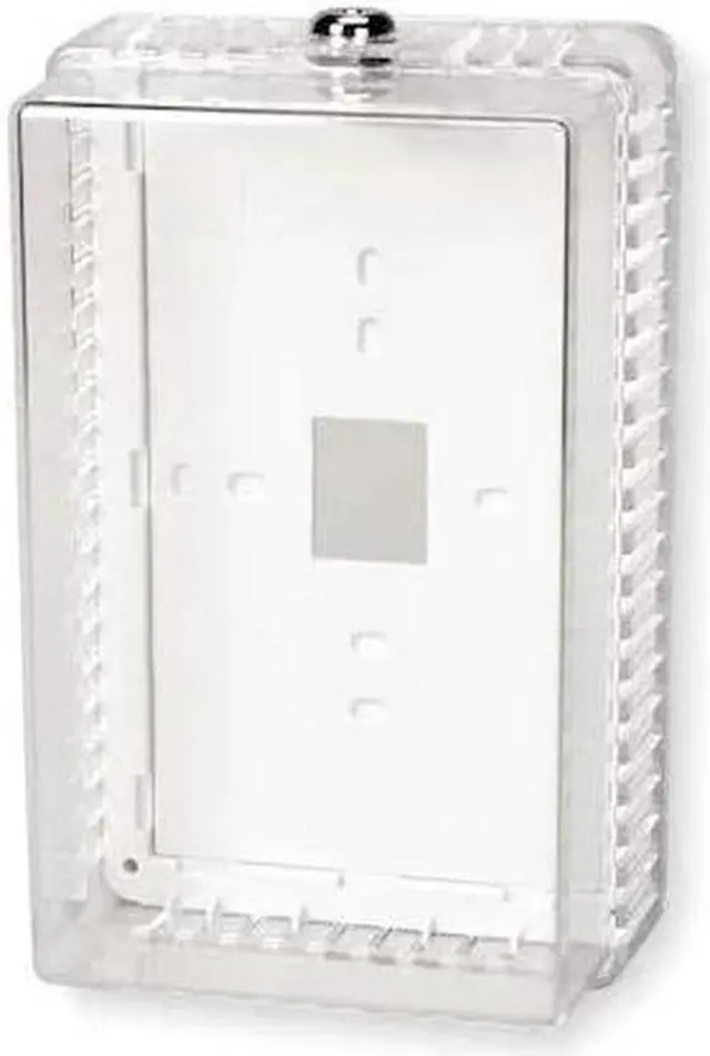 California Proposition 65: This product contains a chemical known to the State of California to cause birth defects or other reproductive harm. Universal Thermostat Guard, Base Type Ring Base, Solid Base, Cover Type Snap-On, Guard Construction Single Wall, Inside Depth 3 1/2 in, Inside Height 8 11/16 in, Inside Width 5 3/16 in, Material Plastic, Mounting Direction Horizontal or Vertical, Outside Depth 3 7/8 in, Outside Height 9 11/16 in, Outside Width 6 3/16 in, Thermostat Guard Cover Color Clear, Finish Cover Clear, Base and Ring Off-White, Includes Mounting Hardware, Includes Baseplate Yes, Number of Keys 2. This item has been restricted from sale in the following state (s): []
