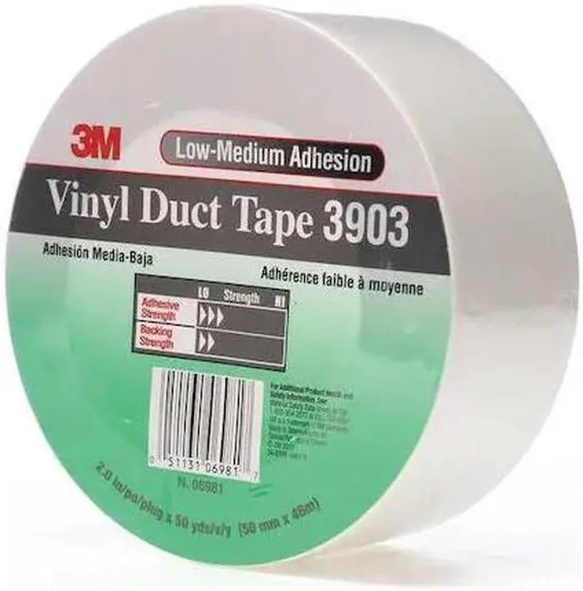 Adhesion to Steel 15.4 oz/in, Tape Brand 3M (TM), Assembly and Manufacturing, General Maintenance and Repair, Safety, Warehouse, Environment Indoor, Imperial Tape Length 50 yd, Imperial Tape Width 2 in, Continuous Roll, Series 3903, Tape Adhesive Material Rubber, Tape Backing Material Vinyl Coated Cloth, Tape Color White, Tape Sub-Type General Purpose Duct Tape, Tape Thickness 6.5 mil, Duct and Repair Tape, Maximum Tape Performance Temperature 200 Degrees F, Metric Tape Length 45.7 m. This item has been restricted from sale in the following state (s): []