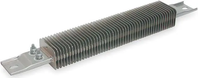Finned Strip Heater, Heater Voltage 120V AC, Overall Length 12 in, Mounting Dimension 11 in, 900 W Watts, Watt Density 34 W/sq in, Terminals Parallel, Element Width 1 1/2 in, Sheath Material 304 Stainless Steel, Material Nickel Plated Steel, 1 Phase, H x W Across Fins 1 3/8 x 2 in, Max. Sheath Temp. 1, 200 Degrees F, Mounting Type Surface Mount, Slotted Hole Length 1/2 in, Slotted Hole Width 5/16 in, Screw Size 10-32, Standards UL Recognized, Includes Mounting Tabs.