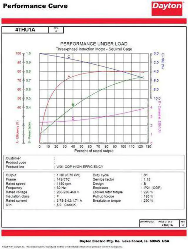 General Purpose Motor, Three-Phase, Open Drip Proof Motor Enclosure Design, 1 HP, Nameplate RPM 1, 140, Frame 145TC, Voltage 230/460V AC, 60 Hz Hz, Three Phase, Full Load Amps 3.3 / 1.7 A, C-Face Motor Mounting Type, Motor Thermal Protection None, Ins. Class F, Motor Service Factor 1.15, Ball Motor Bearings, Motor Frame Material Steel, Max. Ambient Temp. 40 Degrees C, CW/CCW Motor Shaft Rotation, Nominal Efficiency 82.5 Percent, Continuous Duty, 1, 101-1, 200, CSA, UL.