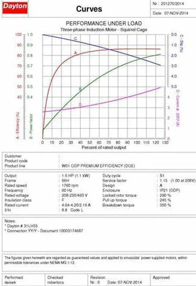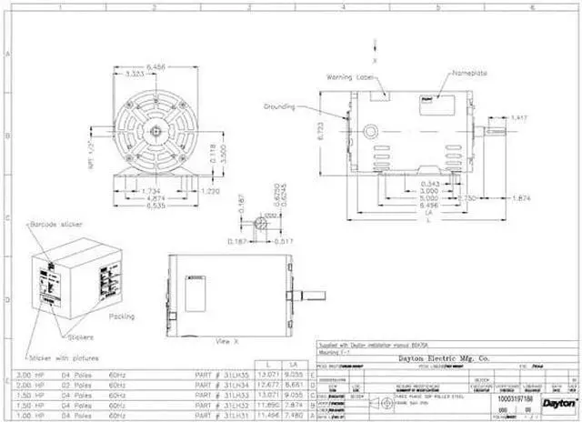 General Purpose Motor, Three-Phase, Open Drip Proof Motor Enclosure Design, 1 1/2 HP, Nameplate RPM 1760, Frame 56H, Voltage 230/460V AC, 60/50 Hz Hz, Three Phase, Full Load Amps 4.2 / 2.1 A, Rigid Base Motor Mounting Type, Motor Thermal Protection None, Ins. Class F, Motor Service Factor 1.15, Ball Motor Bearings, Motor Frame Material Steel, Max. Ambient Temp. 40 Degrees C, CW/CCW Motor Shaft Rotation, Nominal Efficiency 86.5 Percent, Continuous Duty, 1701-1800, CSA, UL.