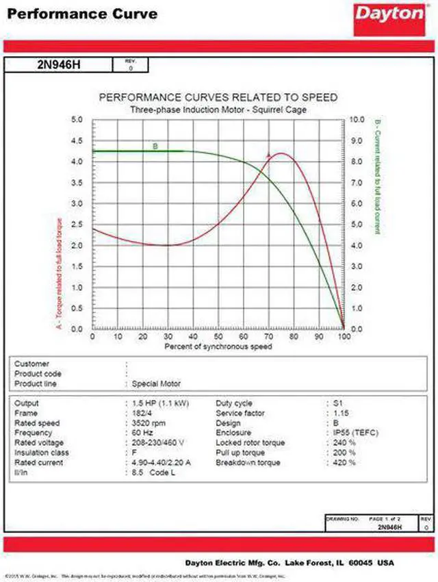 General Purpose Motor, Three-Phase, Totally Enclosed Fan Cooled Motor Enclosure Design, 1 1/2 HP, Nameplate RPM 3455, Frame 182/4, Voltage 230/460V AC, 60 Hz Hz, Three Phase, Full Load Amps 3.9 / 1.9 A, Rigid Base Motor Mounting Type, Motor Thermal Protection None, Ins. Class F, Motor Service Factor 1.15, Ball Motor Bearings, Motor Frame Material Steel, Max. Ambient Temp. 40 Degrees C, CW/CCW Motor Shaft Rotation, Nominal Efficiency 84 Percent, Continuous Duty, 3001-3600, CSA, UL.