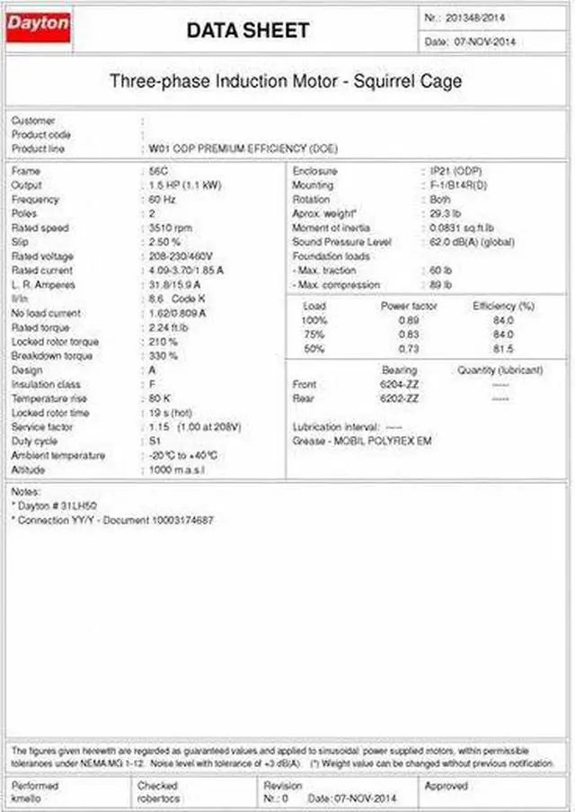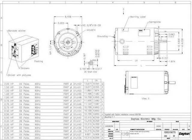 General Purpose Motor, Three-Phase, Open Drip Proof Motor Enclosure Design, 1 1/2 HP, Nameplate RPM 3510, Frame 56C, Voltage 230/460V AC, 60 Hz Hz, Three Phase, Full Load Amps 3.7 / 1.9 A, C-Face Motor Mounting Type, Motor Thermal Protection None, Ins. Class F, Motor Service Factor 1.15, Ball Motor Bearings, Motor Frame Material Steel, Max. Ambient Temp. 40 Degrees C, CW/CCW Motor Shaft Rotation, Nominal Efficiency 84 Percent, Continuous Duty, 3001-3600, CE, CSA, UL.