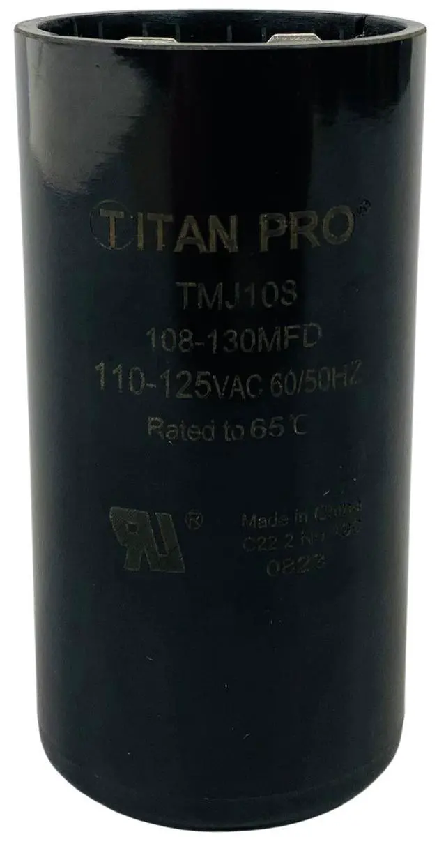 Brandnew Packard start capacitor, model TMJ108 (108125 / 108130 MFD), designed for intermittentduty AC motor starting circuits. This Titan Prograde capacitor delivers reliable starting torque for compressors, blowers, and other singlephase motors requiring a 108–130 MFD, 110–125 Volt start capacitor.