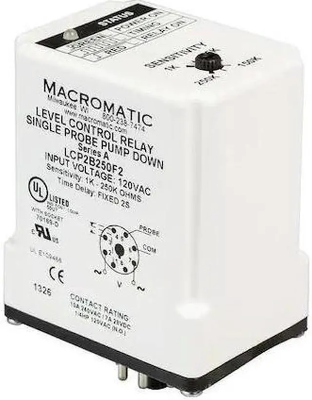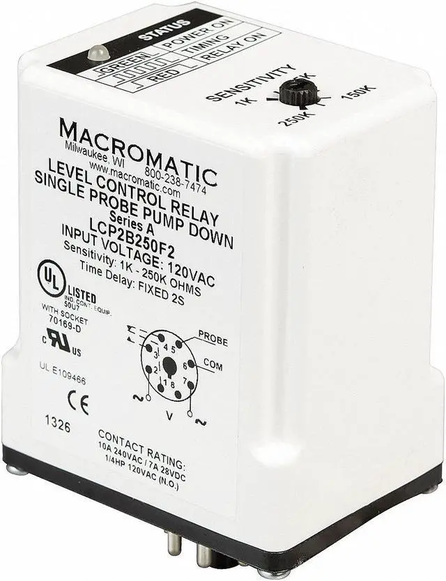 Level Control Relay, Base Shape Octal, Contact Form SPDT, Current Rating 10 A, Electrical Connection 8-Pin Terminal, Flat Pin Width Not Applicable, Input Voltage 120V AC, Minimum Resistance Sensitivity 1, 000 ohm, Maximum Resistance Sensitivity 250, 000 ohm, Number of Pins 8, Number of Probes Single Probe, Relay Function Pump Down, Contact Rating (AC) 10 A @ 240V AC, Contact Rating (DC) 7 A @ 28V DC, Mounting Style Socket, Status Indicator LED Indicator, Body Depth 2.8 in, Body Height 3.2 in.