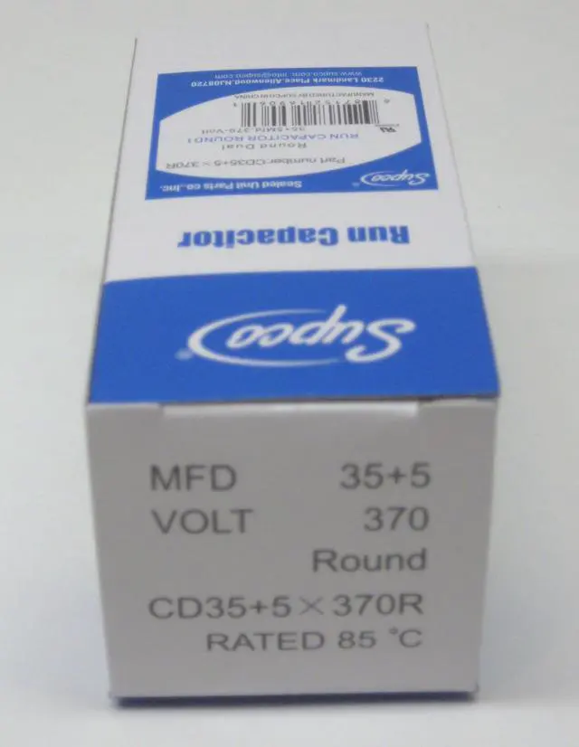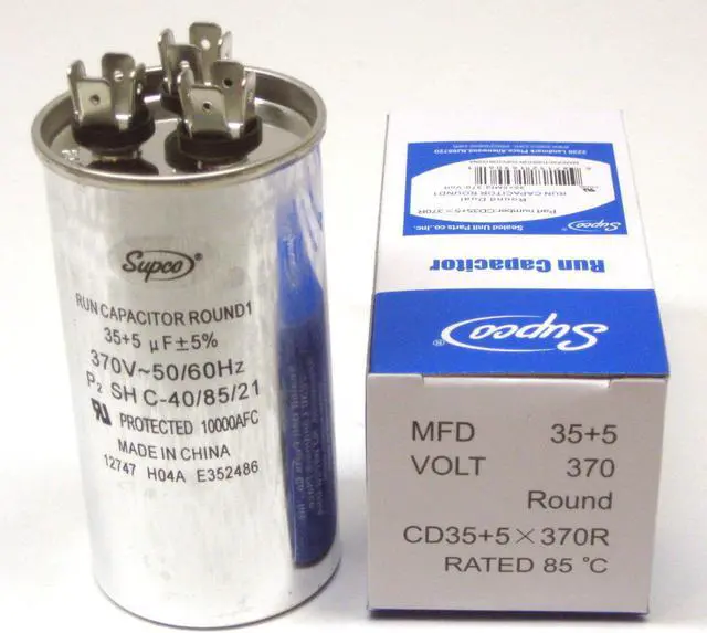 Ensure dependable motor performance with this brand-new CD35+5X370R dual round run capacitor. Designed for HVAC systems and appliances requiring dual capacitance, this capacitor features a rugged drawn steel case, quad blade terminals, and biodegradable synthetic oil for safe, long-lasting operation. Manufactured by Supco in Nanchang, Jiangxi, China, it meets OEM standards and is ideal for compressors, fan motors, and blower units.