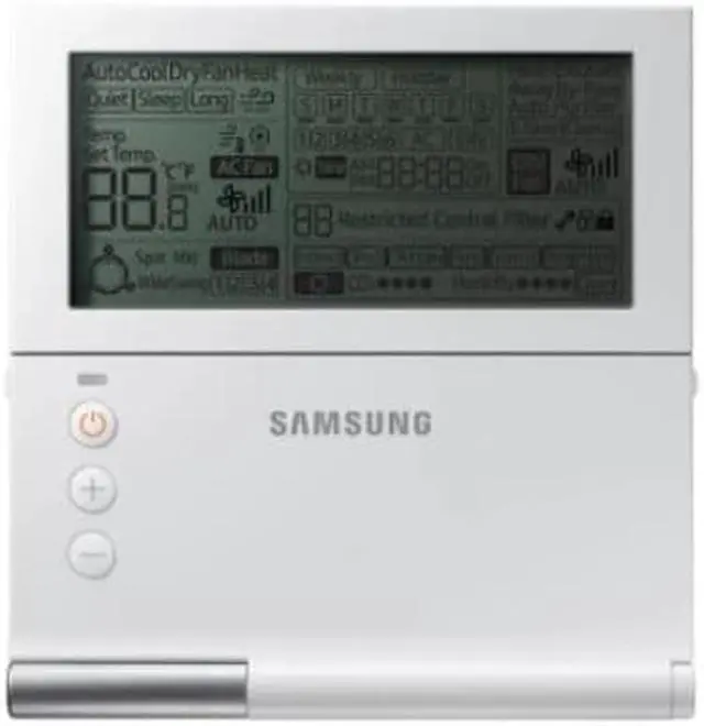 Samsung MWR-WE13U wired controller is a weekly programmable backlit thermostat able to set desired A/C operation mode, setting temperature and fan speed to operate based on weekly schedules. It can sense temperature via internal sensor, that inside indoor unit, or use the average temperature between controller and air handler temperature sensors. Independent louver control is available for FJM Series Mini 4-way cassette models.