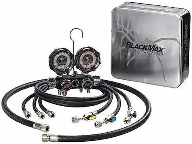 Manifold Gauge Set, Number of Valves 4, R-134A, R-22, R-404A, R-410A, Number of Hoses 3, 5 ft, 0 to 800 psi, 30 in Hg to 500 psi, +/- 1.00 Percent, 3/8 in, Aluminum, Black Chrome Hoses, UL/SAE, Includes Carrying Case. This item has been restricted from sale in the following state (s): []