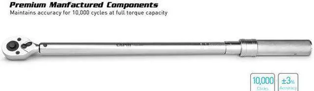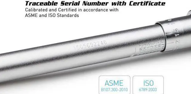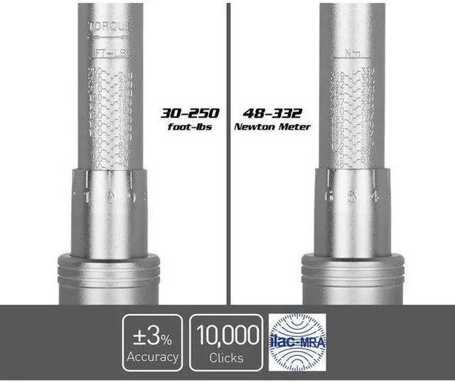 California Proposition 65: This product contains a chemical known to the State of California to cause birth defects or other reproductive harm. With a 1/2 inch drive and +/-3% clockwise accuracy, this torque wrench surpasses professional quality and meets industrial quality where every detail counts. Premium components, lubricants, and technologically advanced internal mechanisms are utilized to make for a powerful torque wrench that excels in daily long-term industrial use. The entire body is 100% steel and feels solid in your hand with the knurled handle's non-slip grip. The engraved Foot-Pound and Newton Meter dual scale provides a vivid and clear reading of the measurement. Adjustment is available anywhere between 30-250 ft-lbs or 48-332 Newton Meters. As a testament to its quality, each one of our torque wrenches comes with an individualized certificate of calibration.