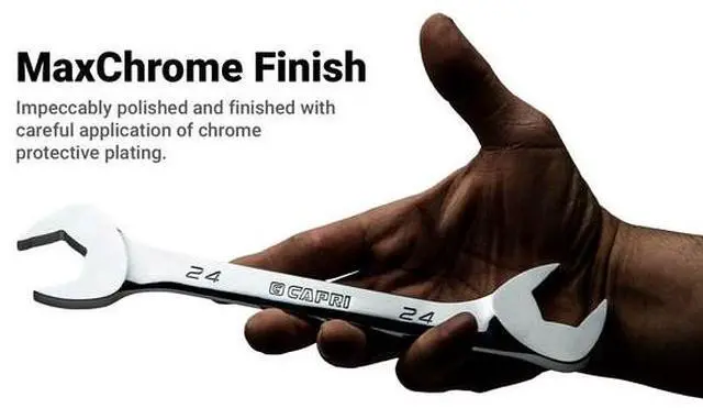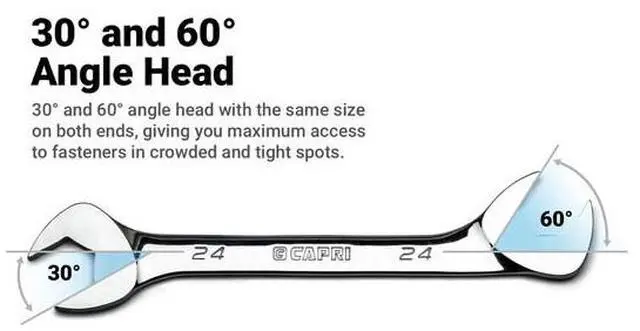 California Proposition 65: This product contains a chemical known to the State of California to cause birth defects or other reproductive harm. The Capri Tools 30Deg and 60Deg Angle Open End Wrenches let you access hardtoreach areas where clearance is limited 30Deg and 60Deg angle open ends with the same size opening on both ends, these wrenches give you maximum access to the fastener you want to reach Vshaped open end with antislip groove grabs fasteners securely on four sides, giving you the leverage you need Made with premium Chrome Vanadium steel and each wrench is impeccably polished and finished with careful application of our MaxChrome protective plating, ensuring durability and corrosion resistance