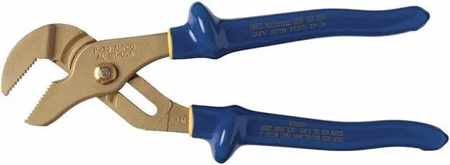 Tongue and Groove Plier, Plier Type Tongue & Groove Pliers, Jaw Shape Flat, Overall Length 10 1/4 in, Maximum Jaw Opening 1 1/2 in, Number of Jaw Positions 5, Jaw Width 1 1/2 in, Jaw Length 1 1/2 in, Non-Sparking Yes, Insulated Yes, Voltage Rating 1, 000 V, Tether Ready No, Features 1000V Rated, Corrosion Resistant, Insulated Plier, Non-Magnetic, Non-Sparking, Finish Uncoated, Handle Color Blue, Jaw Opening Type Manual, Plier Material Nickel Aluminum Bronze. This item has been restricted from sale in the following state (s): []