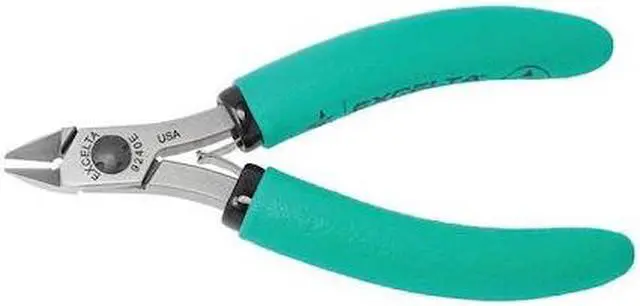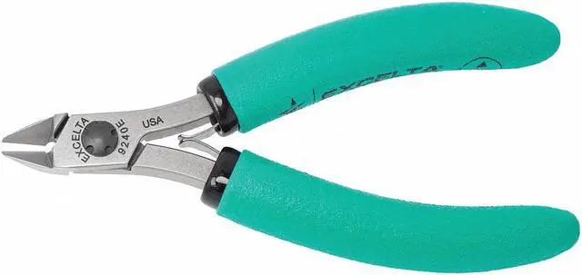 You can rely on the Excelta 9240E ESD Diagonal Cutting Plier to cut wire, metal and soft plastic with ease. The pliers have a 25/64 in. jaw length and 27/64 in. jaw width for handling different tasks. They are made of carbon steel, which is stronger than other materials used in cutting pliers. The dual leaf springs ensure smooth action while the induction hardened blades help to keep the tool sharp longer. It also has a soft cushioned foam handle for added comfort when working long hours with it. With its 4 1/2" length, you will be able to use this diagonal cutting plier for all your jobs without difficulty or fatigue.