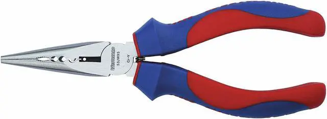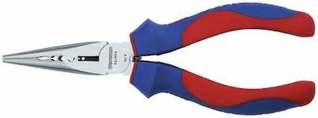 Needle Nose Plier, Uninsulated, Nonsparking No, ESD Safe No, Side Cutter Yes, Wire Stripper Yes, Wire Crimper Yes, Jaw Bend 0 Degrees, Overall Length 6 In., Standard Tool (Accessory Needed for Tethering), Joint Type Solid, Gripping Surface Serrated, Spring Return Yes, Jaw Length 2 In., Tip Width 1/8 In., Max. Jaw Opening 2-1/4 In., Handle Type Ergonomic, Handle Color Blue/Red, Material Chrome Vanadium Steel, Cutting Capacity/Material 1/16 In. Medium Piano Wire, Voltage